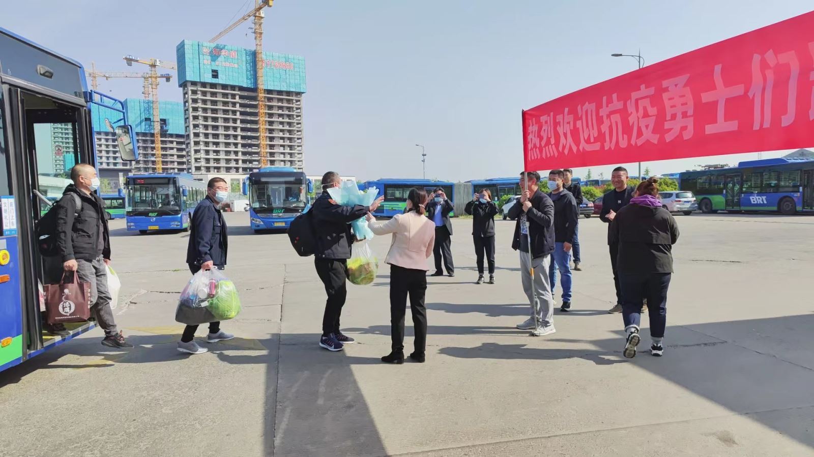 4月17日早上8點53分,公交集團快速公交事業部西城停車場內熱鬧非凡,隨著一陣熱烈的掌聲迎來了參加港城疫情轉運勇士們的凱旋。