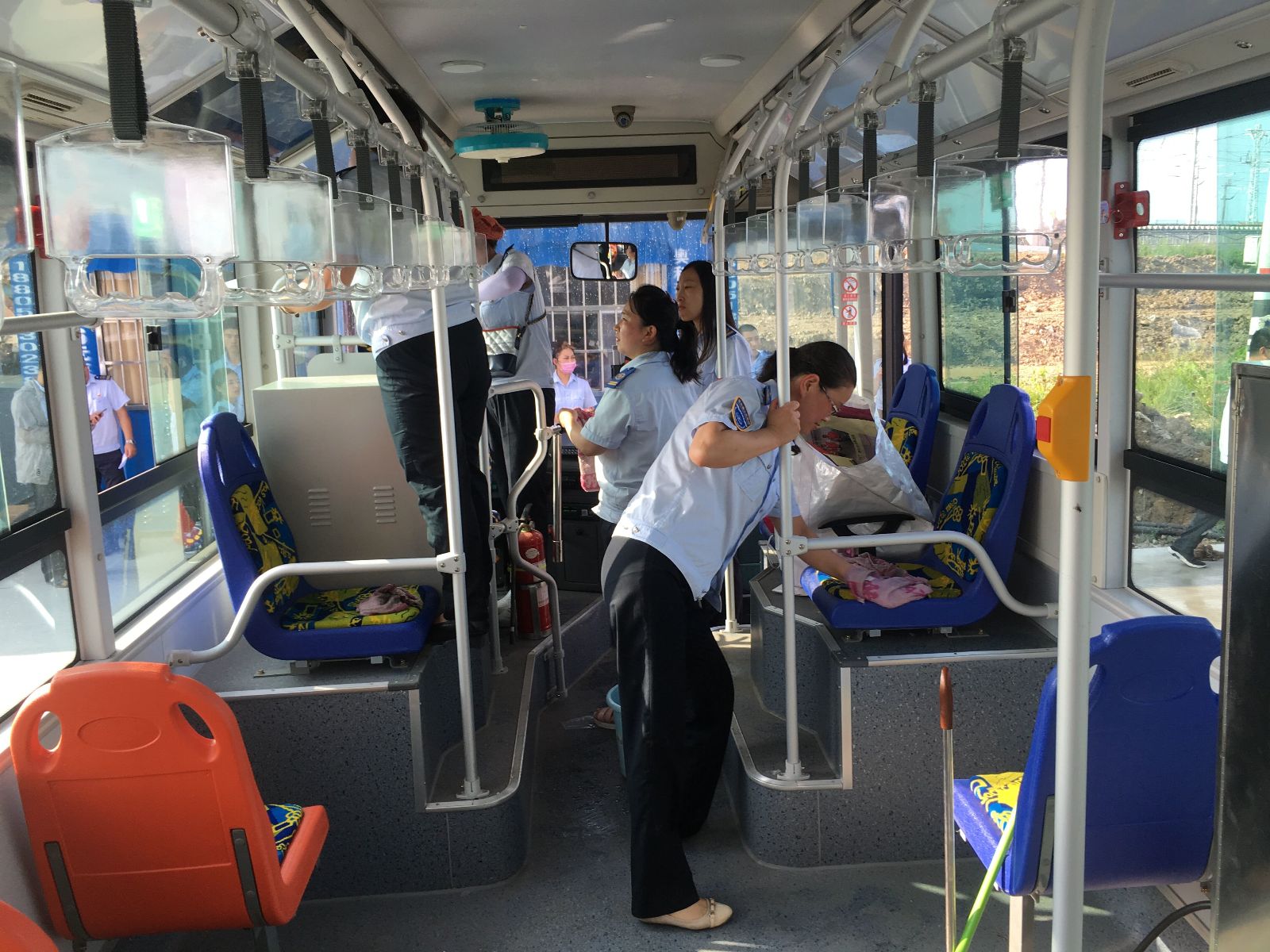 7月3日下午,公交集團海通公交公司黨總支書記莊劉柱、工會主席胡秀琴帶領科室人員及部分駕駛員來到江化北路停車場,為新車開展大掃除工作,由于新車停放時間較長,衛生較臟,大家克服高溫,不怕苦累,拿著抹布、掃帚、水桶、拖把等清潔工具,認真的清掃車廂,確保每臺車輛干凈整潔,運營科工作人員還將車廂內文明標語、禁煙標識、上下客門貼等標識標貼進行張貼,確保每輛公交車以最佳車容車貌迎接市民乘客的到來。