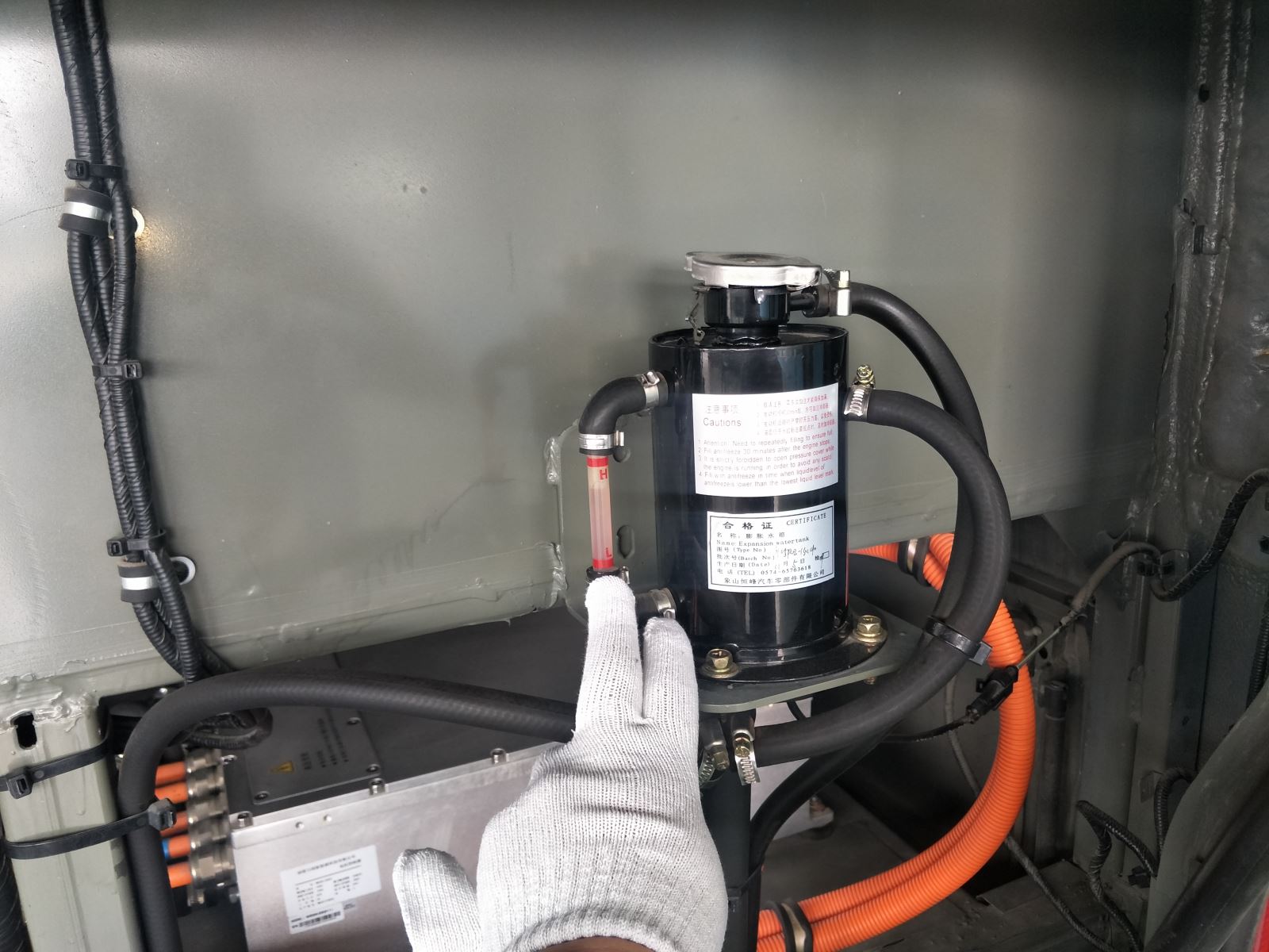 3.熱車后,檢查防凍液儲(chǔ)水罐上端的回水管回水情況,若回水不暢或堵塞會(huì)造成水溫過高。
