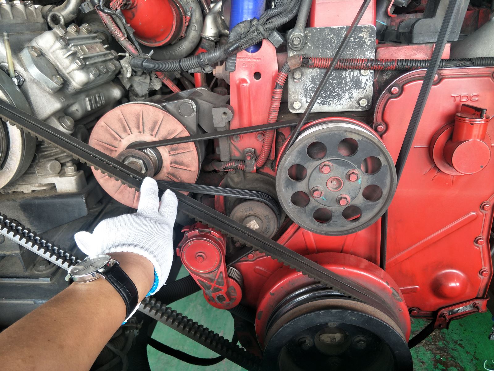 經(jīng)常檢查水泵工作情況和風(fēng)扇皮帶張緊力,風(fēng)扇皮帶不可沾油,防止風(fēng)扇皮帶打滑。要密切注意水泵漏水情況,注意將百葉窗開足。