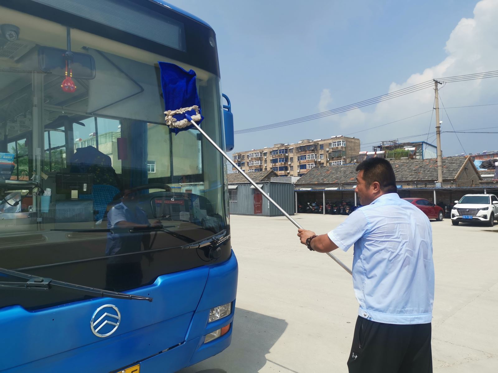 駕駛員抽出空隙時(shí)間打掃車輛衛(wèi)生,汗水浸透了衣衫,只為給乘客提供一個(gè)舒適整潔的乘車環(huán)境,使乘客出行乘坐公交時(shí)能有一份好心情。